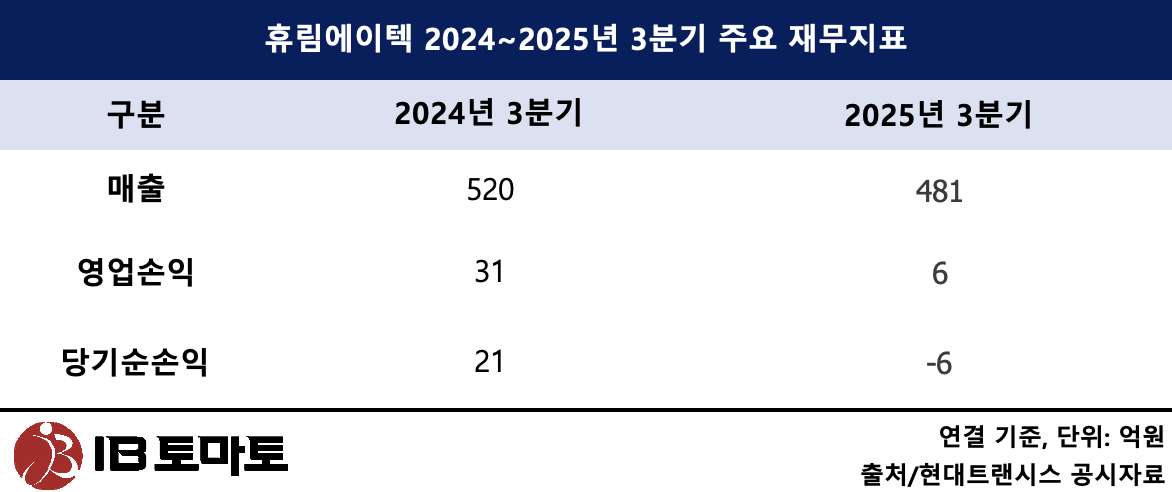 28일 금융감독원 전자공시시스템에 따르면 지난해 3분기 휴림에이텍의 누적 매출액은 481억원, 영업이익 6억원을 기록했다. 전년 동기 매출액 520억원, 영업이익 31억원과 비교하면 수익성은 다소 떨어졌지만 흑자 기조를 유지하고 있는 상황이다.